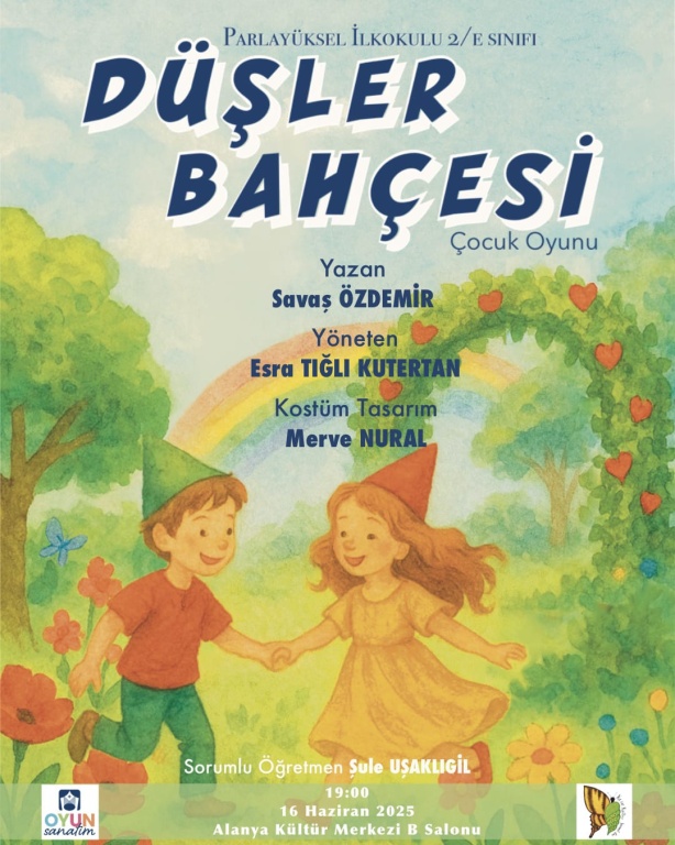 Okulumuz 2-E sınıfı öğrencileri 16 Haziran 2025 Pazartesi akşamı Alanya Kültür Merkezi'nde sunacakları "Düşler Bahçesi" adlı tiyatro oyununun hazırlıklarına son sürat devam ediyorlar. Oyunumuza Alanya Belediye Tiyatrosu oyuncularından Esra Tığlı KUTERTAN'ın desteği ile 2-E sınıfı öğrencileri aylardır hazırlanmakta.Tüm öğrencilerimizi aileleriyle birlikte 16 Haziran 2025 Pazartesi akşamı saat 19.00'da Alanya Kültür Merkezi'ne "DÜŞLER BAHÇESİ" adlı tiyatro oyununumuza bekliyoruz.